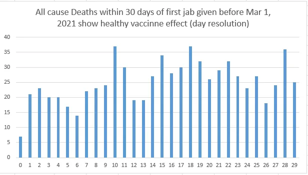 Eine Vergrößerung der ersten 30 Tage zeigt, dass es in den 14 Tagen nach der Impfung keinen Spike gibt. Dies bedeutet, dass die Spitze in VAERS ein Meldeartefakt ist (bei zeitlicher Nähe wird eher gemeldet). Sie können auch den Bias bei gesunden Patienten erkennen, der die Todesfälle direkt nach der Impfung nach unten treibt (Menschen, die kurz vor dem Tod stehen, werden selten geimpft).