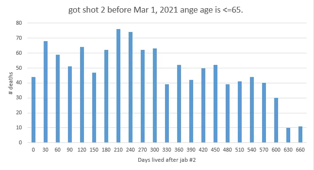 Betrachten wir nun nur die Altersgruppe 65 Jahre und jünger. Die Zahl der Todesfälle erreicht in etwa 6 Monaten ihren Höhepunkt und fällt dann ab. Vielleicht sind sie in 2 Jahren wieder normal, aber das können wir anhand der Daten nicht sagen, weil wir nicht über den vollständigen Datensatz verfügen, den wir für eine richtige Analyse benötigen.