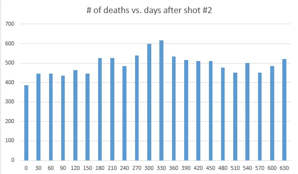 Hier sind die Tage, die du gelebt hast, nachdem du gespritzt wurdest #2 (für diejenigen, die vor dem 1. Januar 2023 gestorben sind). Beachten Sie, wie sie um die 1-Jahres-Marke herum ihren Höhepunkt erreicht und dann abfällt. Dies gilt für alle Altersgruppen. Nach der 2. Impfung sehen wir also den gleichen Spitzenwert wie nach der 1. Der Impfstoff erhöht also das Risiko über einen langen Zeitraum.