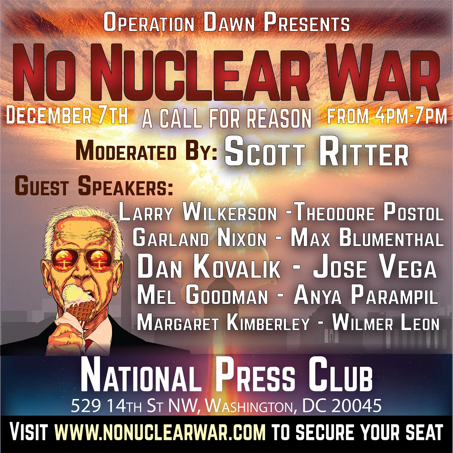 Am 7. Dezember findet im National Press Club in Washington, D.C., eine Veranstaltung mit dem Titel „No Nuclear War“ statt, bei der führende Experten wie Larry Wilkerson, Theodore Postol, Melvin Goodman, Max Blumenthal, Anya Parampil, Margaret Kimberly, Garland Nixon, Dan Kovalik, Wilmer Leon und andere, darunter auch der Autor dieses Artikels, über die Gefahr eines Atomkriegs und die Möglichkeiten zu seiner Verhinderung diskutieren werden.