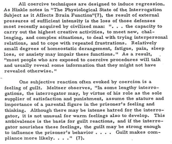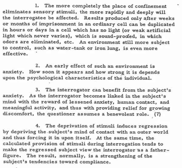 „Es ist wenig gewonnen, wenn der Freiheitsentzug lediglich eine Routine durch eine andere ersetzt. Gefangene, die ein monotones, abwechslungsloses Leben führen, … werden stumpf, apathisch und depressiv. Und Apathie kann eine sehr effektive Verteidigung gegen Verhöre sein. Die Kontrolle über die Umgebung des Gefangenen ermöglicht es dem Vernehmer, seine Ernährung, sein Schlafverhalten und andere grundlegende Dinge zu bestimmen.