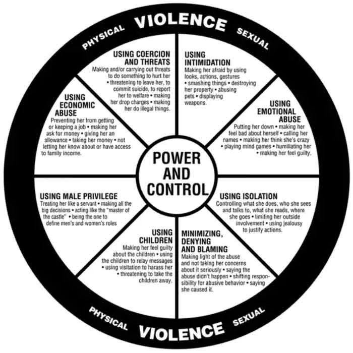 Und hier ist das „Rad des Missbrauchs“, ein Diagramm, das oft in Unternehmen verwendet wird, wenn über häusliche Gewalt gesprochen wird. Haftungsausschluss: Ich unterstütze den Teil des Diagramms, der sich mit dem „männlichen Privileg“ befasst, nicht. Dieses „Privileg“-Gerede soll „spalten und erobern“ und ist wahrscheinlich von den Alphabeten entworfen worden – aber das Rad ist ziemlich aufschlussreich, wenn man die „COVID-Reaktion“ im Hinterkopf behält.