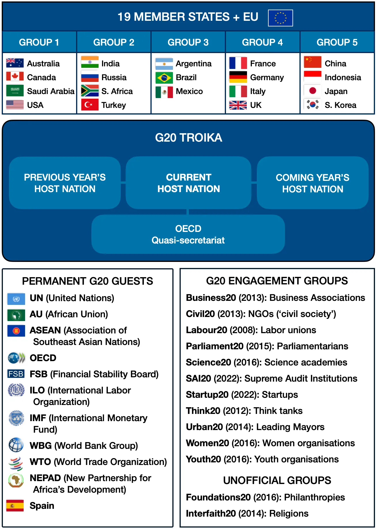 Der Generalsekretär der Vereinten Nationen ist ständiger Gastteilnehmer, ebenso wie Vertreter der Organisation für wirtschaftliche Zusammenarbeit und Entwicklung (OECD), der ASEAN, der WTO, der IAO, des IWF, der Weltbank und des Finanzstabilitätsrats.