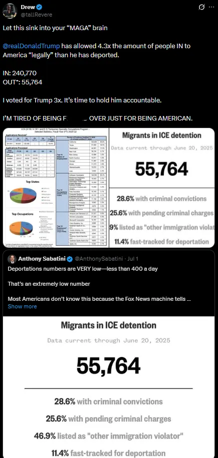 Es ist wichtig zu betonen, dass die ICE unter Trump kaum Menschen abgeschoben hat, entgegen seinen Wahlversprechen von Massenabschiebungen, und deutlich weniger als Präsident Obama und bei diesem Tempo sogar weniger als Präsident Biden, wie ich bereits zuvor dokumentiert habe; und wenn man die Selbstabschiebungen herausrechnet, sinkt die Zahl sogar noch weiter.