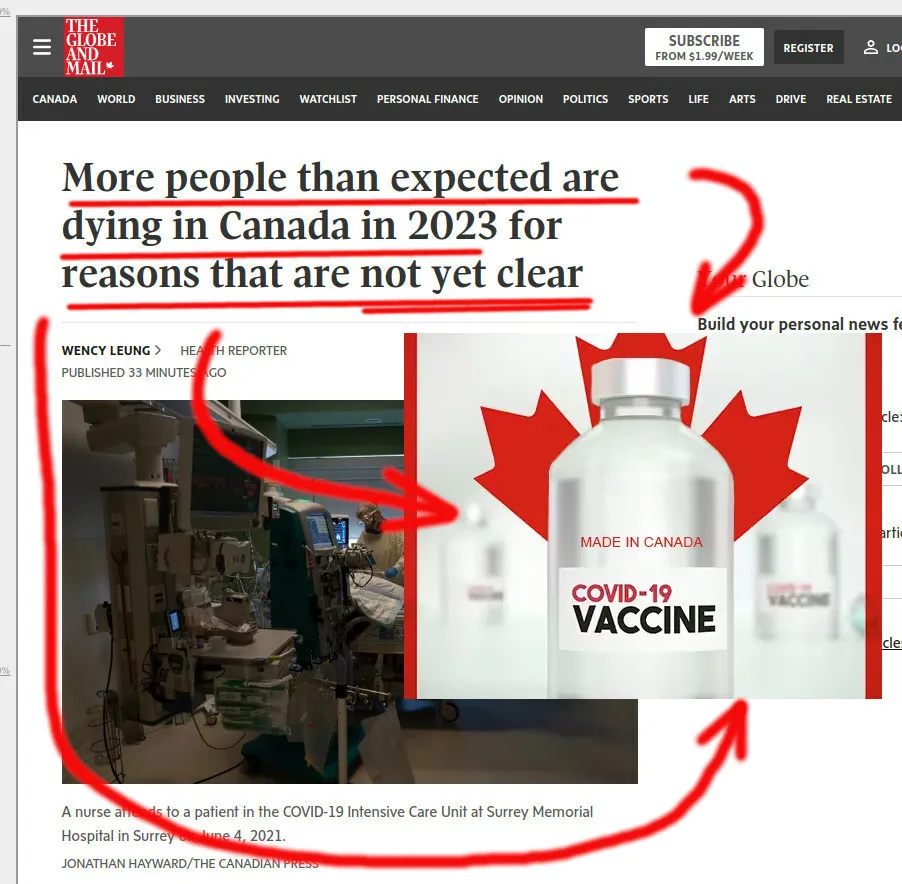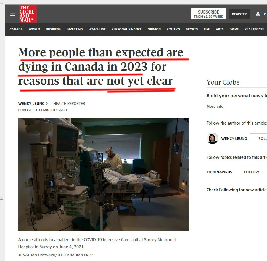 Unerfreuliche Nachrichten aus dem stark COVID-geimpften Kanada. Im Jahr 2023 sind die Todesfälle 15-20% höher als üblich, berichtet die Globe and Mail (Paywall-freier Link). Die Autoren und Gesundheitsexperten sind verblüfft und können den Grund nicht finden.