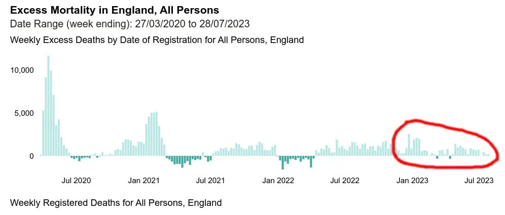 Das Vereinigte Königreich, dessen Durchimpfungsrate höher ist als die der USA, aber niedriger als die Kanadas, befindet sich merkwürdigerweise in einer ähnlichen Zwischenposition, was die überzähligen Todesfälle angeht (das nachstehende Diagramm bezieht sich nur auf England):
