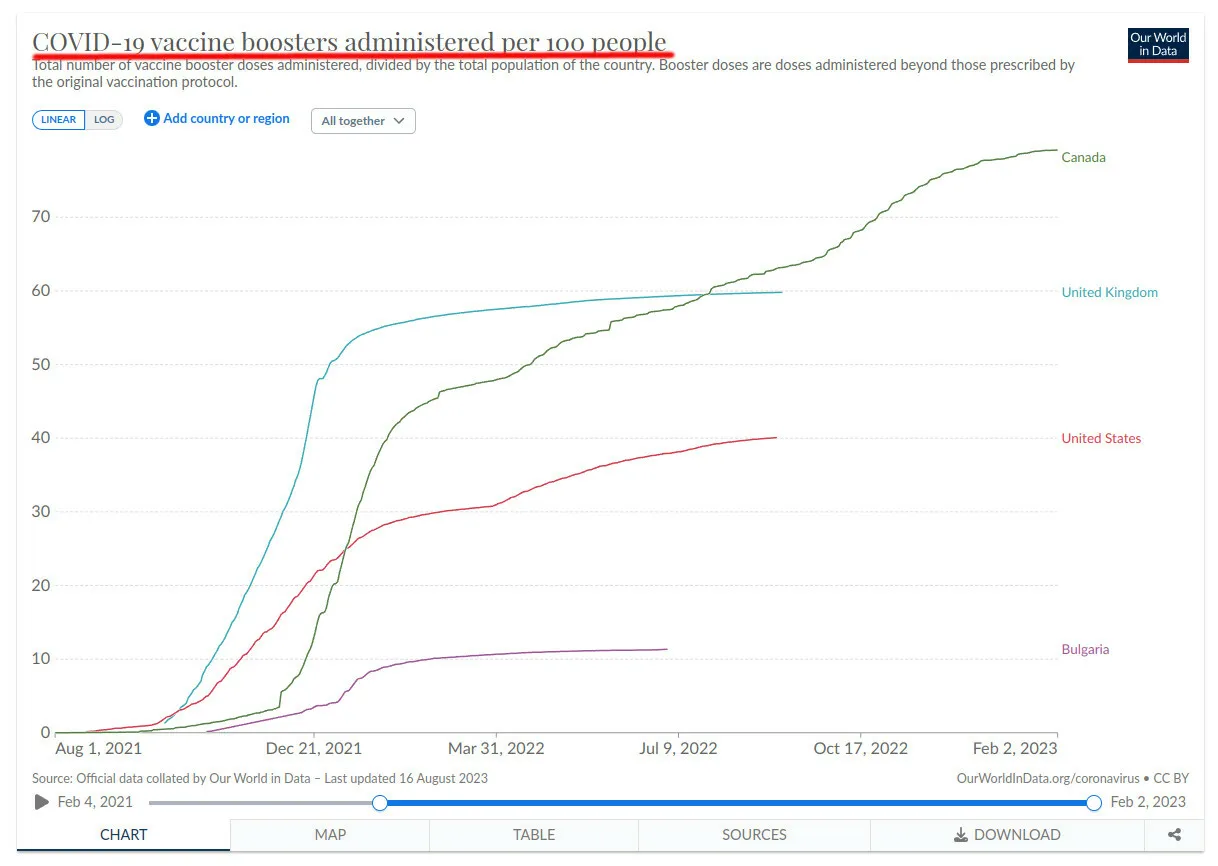 Kanada ist eines der am stärksten gegen COVID geimpften Länder der Welt. Betrachten Sie die Auffrischungsrate der Bevölkerung Kanadas, des Vereinigten Königreichs, der Vereinigten Staaten und Bulgariens: