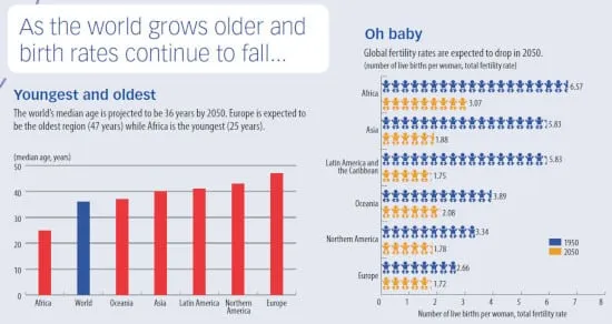 Kurz gesagt: Wenn alle Faktoren gleich sind, liegt die Geburtenrate – die Anzahl der Babys, die jede Frau zur Aufrechterhaltung der aktuellen Bevölkerungszahl zur Welt bringen müsste – bei 2,1. Bis 2050 wird jede Region der Welt mit Ausnahme Afrikas unter dieser Rate liegen.