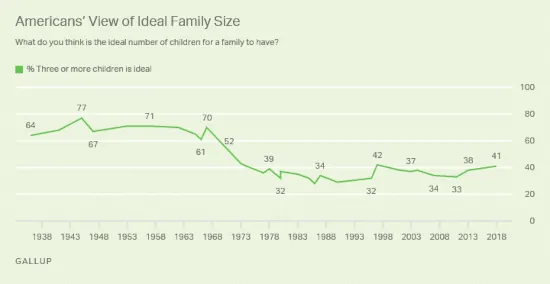 Laut Gallup-Umfragen ist die Zahl der Amerikaner, die glauben, dass zur idealen Familie drei oder mehr Kinder gehören, seit ihrem Höchststand nach dem Zweiten Weltkrieg um fast die Hälfte gesunken: