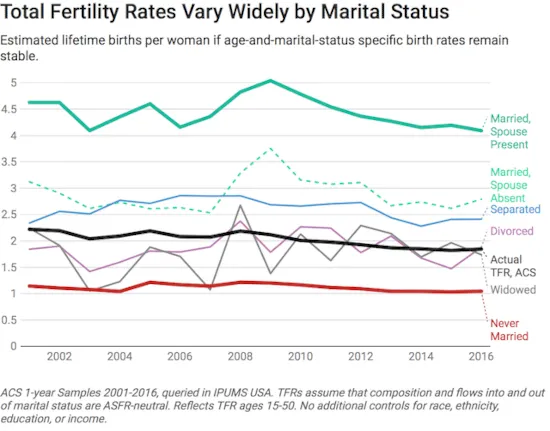 Die Zusammenhänge zwischen Heiratsraten und Geburtenraten sind nicht schwer nachzuvollziehen. Schließlich sollte es nicht überraschen, dass die Geburtenraten von Frauen je nach Ehestatus variieren: