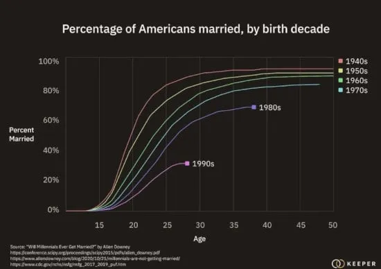Gleichzeitig hat der allgemeine gesellschaftliche Trend, später oder gar nicht zu heiraten, dazu geführt, dass ein größerer Prozentsatz der Bevölkerung in ihren besten reproduktiven Jahren unverheiratet bleibt. Der Prozentsatz der Amerikaner, die mit 30 Jahren verheiratet sind, ist beispielsweise in der jüngsten Kohorte der 30-Jährigen drastisch gesunken.