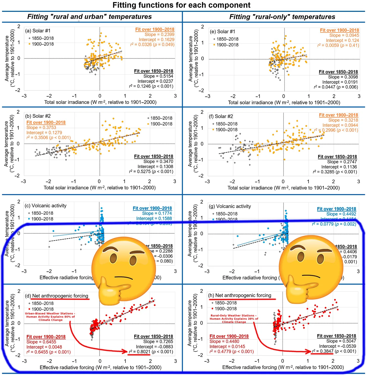 Es stellte sich heraus, dass sowohl die Steigung (die Größe des Effekts) als auch das r-Quadrat (die Erklärungskraft) der menschlichen Aktivität für den ausschließlich ländlichen Datensatz viel geringer waren. Bei den Stationen, die nur auf dem Lande liegen, erklärte der Mensch nur 38 % des Klimawandels, während er bei den Stationen, die in der Stadt liegen, 80 % des Klimawandels erklärte.