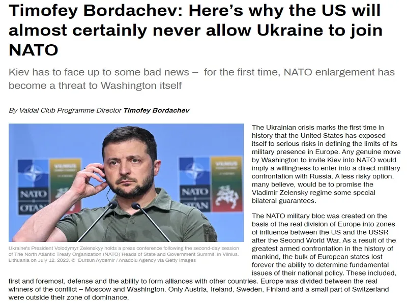 Der Programmdirektor des Valdai-Clubs, Timofei Bordatschow, veröffentlichte am Mittwoch bei RT einen Beitrag darüber, „warum die USA der Ukraine mit ziemlicher Sicherheit niemals den Beitritt zur NATO erlauben werden“. Im Untertitel heißt es: „Kiew muss sich mit einer schlechten Nachricht auseinandersetzen – zum ersten Mal ist die NATO-Erweiterung zu einer Bedrohung für Washington selbst geworden“. Der geschätzte Experte erläutert im größten Teil seines Artikels ausführlich die Beziehungen der USA zu den NATO-Mitgliedern als Stellvertreter und Patron, bevor er mit der folgenden Feststellung schließt: