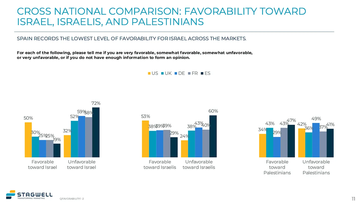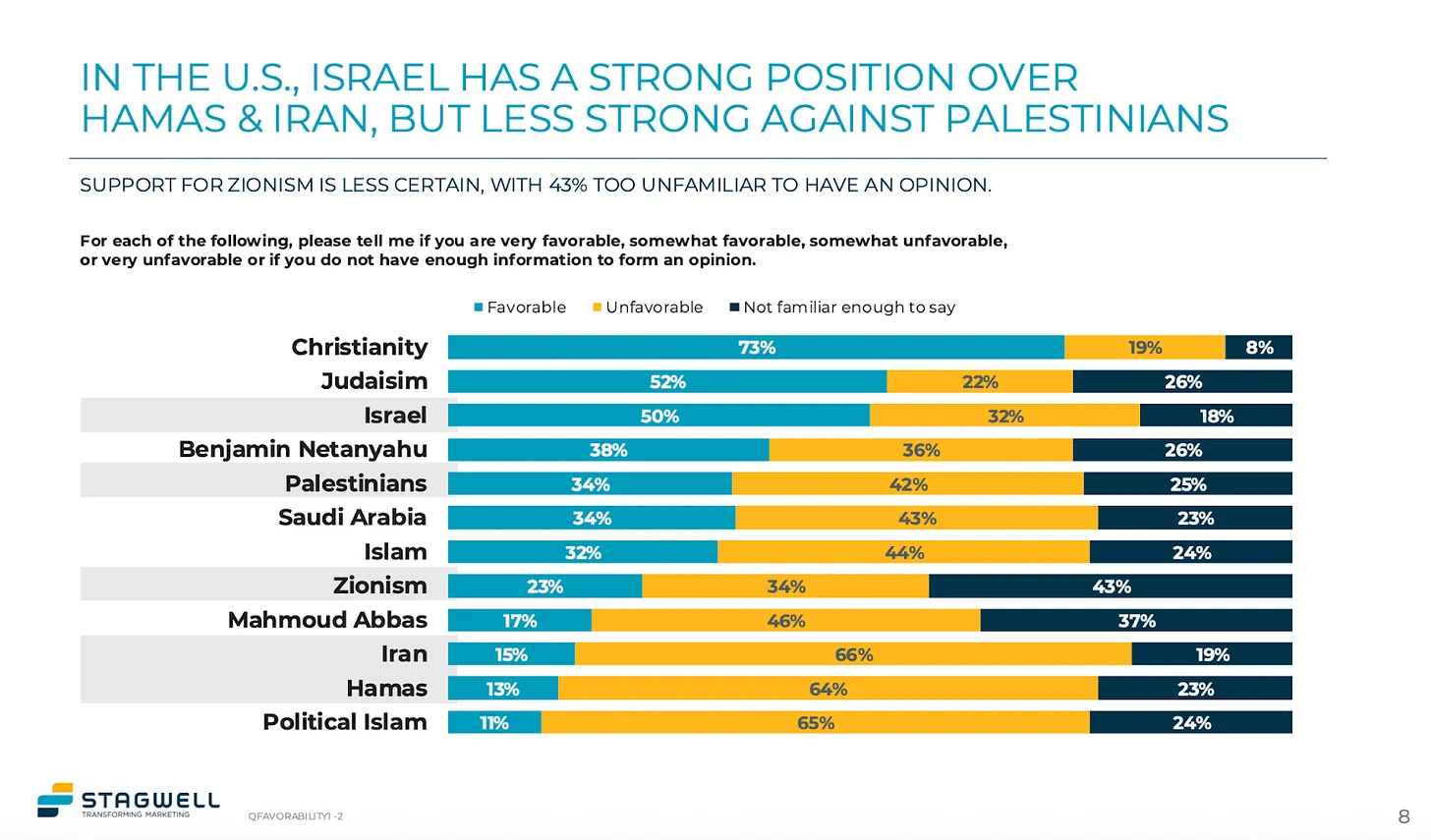 Der Bericht untersuchte die Unterstützung Israels gegenüber der Hamas und dem Iran sowie allgemeiner gegenüber den Palästinensern insgesamt. Die Zahlen im Stagwell-Bericht fallen deutlich günstiger für Israel aus als in anderen Umfragen. Eine kürzlich durchgeführte Quinnipiac-Umfrage ergab beispielsweise, dass 37 % der amerikanischen Wähler angaben, die Palästinenser zu unterstützen, gegenüber 36 %, die sich für die Israelis aussprachen. Bei der Stagwell-Umfrage konnten die Befragten beide Optionen wählen, anstatt sich für eine entscheiden zu müssen, was möglicherweise für die Abweichung verantwortlich ist.
