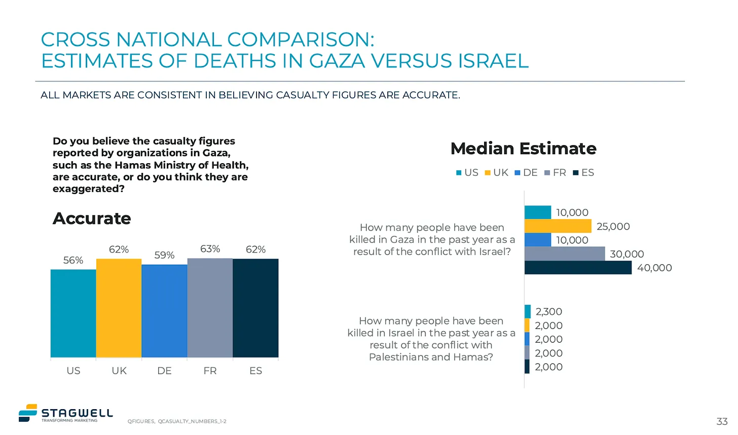 Im Rahmen der Umfrage wurden Menschen in den Vereinigten Staaten, Deutschland, Großbritannien, Spanien und Frankreich gefragt, wie viele Menschen ihrer Meinung nach Israel in Gaza getötet habe und wie hoch der Anteil der Zivilisten unter diesen Opfern sei. Die Befragten in allen Ländern gaben überwiegend an, dass es sich bei den Getöteten „überwiegend um Zivilisten“ handele: