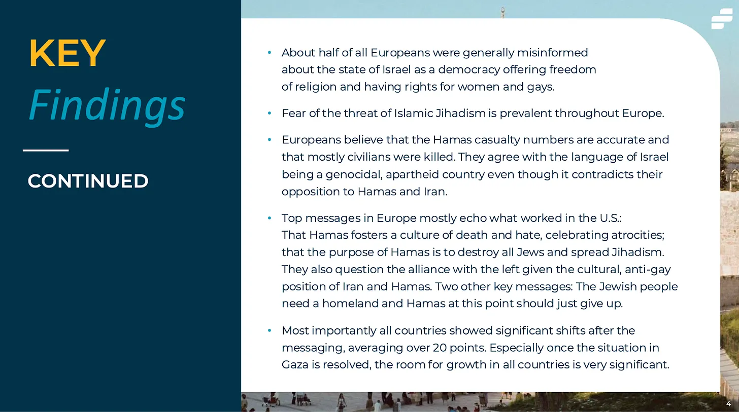 Laut der Studie besteht die beste Taktik Israels, um dem entgegenzuwirken, darin, die Angst vor dem „radikalen Islam“ und dem „Dschihadismus“ zu schüren, die nach wie vor groß ist. Durch die Hervorhebung der israelischen Unterstützung für Frauen- und Homosexuellenrechte bei gleichzeitiger Betonung der Besorgnis, dass die Hamas „alle Juden vernichten und den Dschihadismus verbreiten“ wolle, stieg die Unterstützung für Israel in jedem Land um durchschnittlich über 20 Punkte. „Insbesondere wenn die Situation in Gaza gelöst ist, ist das Wachstumspotenzial in allen Ländern sehr groß“, lautet das Fazit des Berichts.