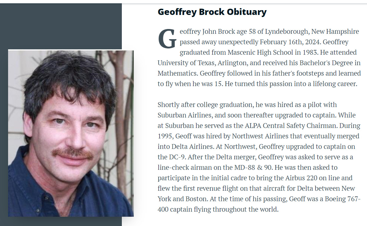 DELTA – NYC – 16. Februar 2024 – Kapitän Geoffrey John Brock, 58, verstarb unerwartet am 16. Februar 2024 während eines Zwischenstopps in Honolulu, HI.