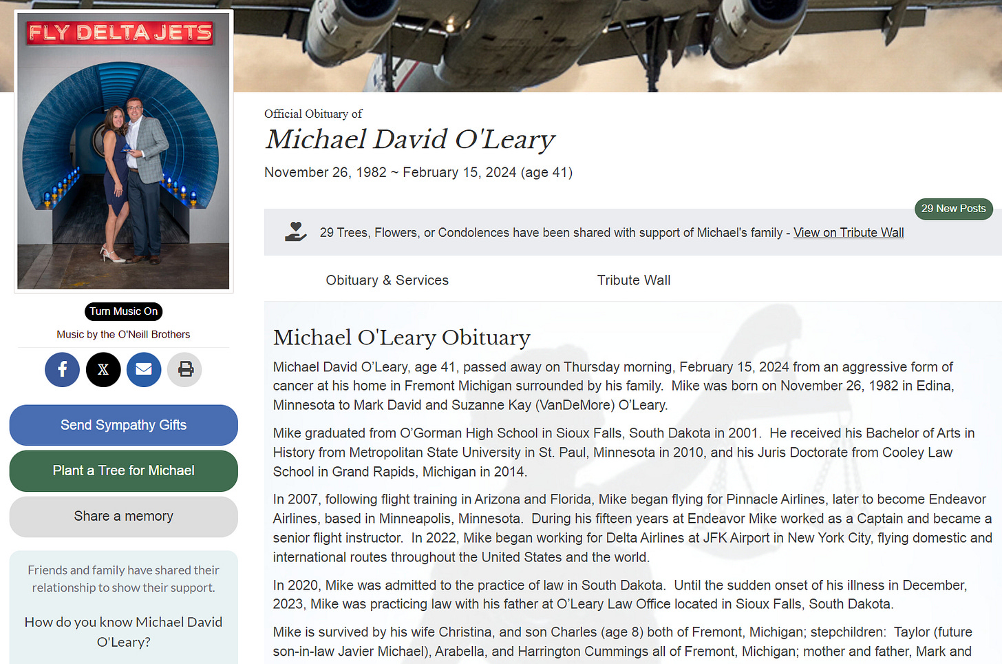 DELTA – NYC – 15. Februar 2024 – Der 41-jährige Michael David O’Leary starb überraschend nach einem sechswöchigen Kampf gegen den Krebs. Im Jahr 2022 begann Mike O’Leary für Delta Airlines am JFK-Flughafen in New York City zu arbeiten und flog nationale und internationale Strecken in den USA und weltweit.