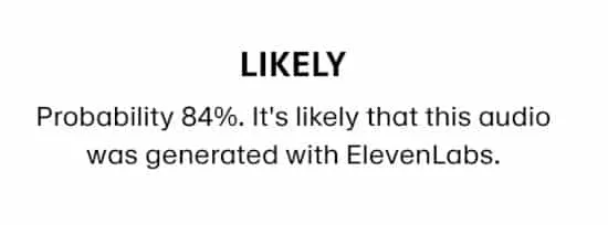 Der „AI Speech Classifier“ von ElevenLabs hingegen bewertet die Wahrscheinlichkeit, dass der Audioclip mit den KI-Audio-Tools von ElevenLabs erstellt wurde, mit 84 %: