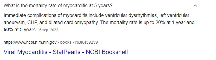 Aber wir wissen, dass die Sterblichkeitsrate bei Myokarditis innerhalb von 5 Jahren bei satten 50 % liegt. Im Gegensatz zu dem, was die Medien einem weismachen wollen, handelt es sich um eine sehr ernste Sache.