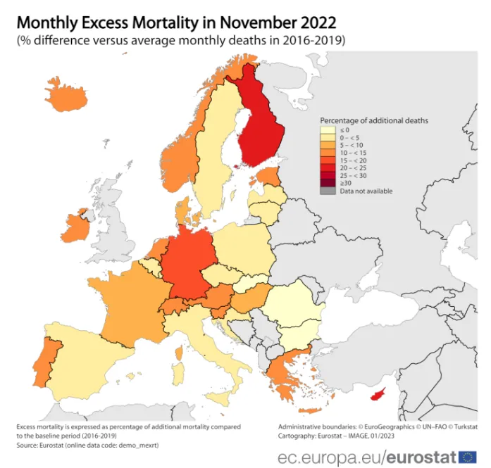 Nach der Masseneinführung der mRNA-Impfung ist die Zahl der überzähligen Todesfälle enorm hoch, im Jahr 2022 wird es mehr überzählige Todesfälle geben als im Jahr 2021, dem Jahr der Einführung des Impfstoffs. Interessanterweise sind die Länder mit der geringsten Zahl an überzähligen Todesfällen in Europa zufällig auch die Länder mit einer niedrigen mRNA-Impfrate. Hmm.
