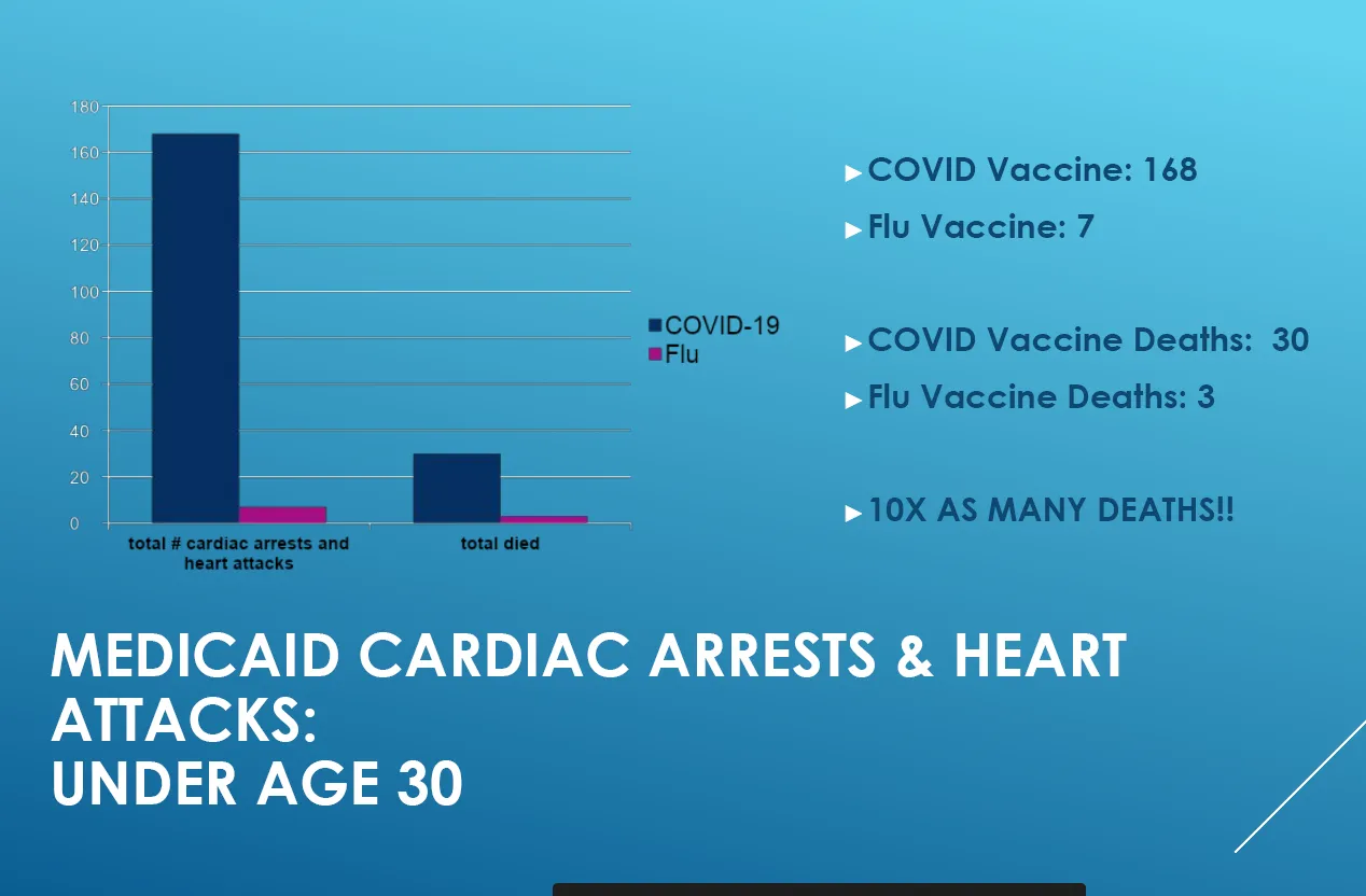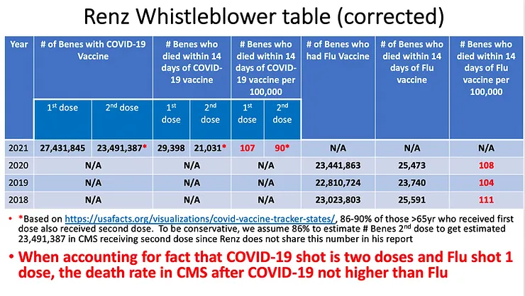 2. Morris sagt, dass innerhalb von 14 Tagen nach der COVID-Impfung (z. B. Spritze Nr. 1) genauso viele Menschen sterben wie nach der Grippeimpfung, wenn man alle Todesfälle verfolgt. Daher ist der COVID-Impfstoff nicht gefährlicher als der Grippeimpfstoff. In der Präsentation wurden 1,17 mehr Menschen mit dem COVID-Impfstoff geimpft, und es gab 29,7 000 Todesfälle im Vergleich zu 25,4 000 Todesfällen (Grippe im Jahr 2020). 29,7/25,4=1,17 deutet darauf hin, dass die Sterblichkeitsrate bei beiden Impfstoffen genau gleich hoch ist. Kurz gesagt, es sieht so aus, als ob alle Todesfälle für beide Impfstoffe einfach „Hintergrundtodesraten für alle Todesursachen“ sind und es hier absolut nichts zu sehen gibt und beide Impfstoffe vollkommen sicher sind.