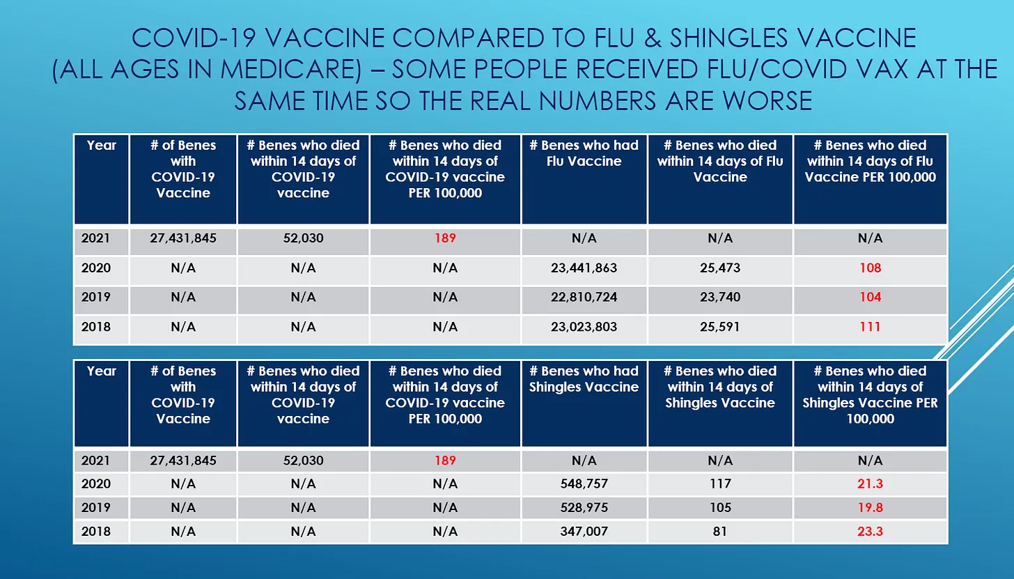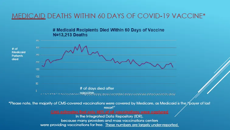 Eine mögliche Erklärung findet sich in dem roten Text auf der Medicaid-Folie oben. Dort heißt es: „CMS schätzt, dass nur 48 % aller Impfungen erfasst wurden„. Die Menschen haben sich außerhalb des CMS-Systems impfen lassen, weil die Impfungen kostenlos waren. Wenn die Leute also in die Apotheke gingen, um sich impfen zu lassen, gab es überhaupt keinen Grund, einen Eintrag im Medicare-System vorzunehmen, da die Impfung kostenlos war. Diese Impfungen wurden also nie in der Medicare-Datenbank erfasst. Diese Personen galten im Medicare-System als „ungeimpft“, so dass es nur halb so viele Todesfälle gab, die durch eine Abfrage wie „14 Tage nach der Impfung gestorben“ erfasst worden wären.