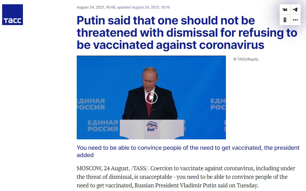 In einer Rede am 22. August bezeichnete Putin die Impfung als „das beste Mittel, das wir haben“, um „die Pandemie zu überwinden“, sagte aber, sie dürfe der Öffentlichkeit nicht aufgezwungen werden.