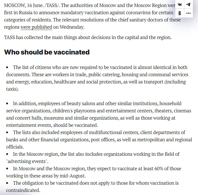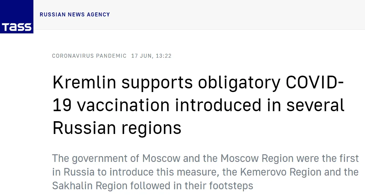 TASS berichtete am selben Tag, dass jedes föderale Subjekt irgendeine Form der Impfpflicht eingeführt hatte.