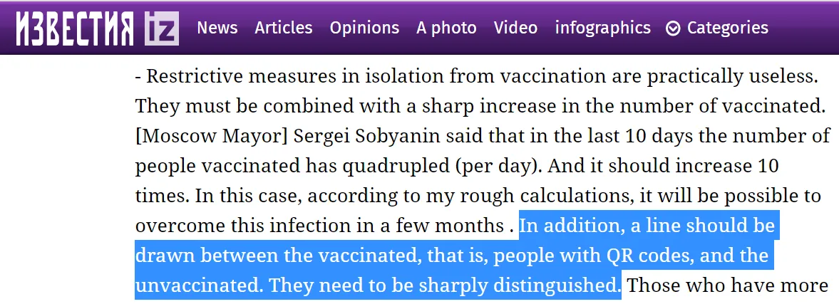 Die Ablehnung des digitalen Impfpasses war sogar noch heftiger. Eine Umfrage vom 14. November ergab, dass von fast 1,5 Millionen Befragten 92 % die Einführung von QR-Codes ablehnten und der Meinung waren, dass diese die Rechte der Bürger verletzen. Die Ergebnisse einer Umfrage auf VK.com vom 25. November waren bemerkenswert ähnlich. Von den 360.000 Personen, die ihre Meinung kundtaten, sprachen sich nur 20.000 für digitale Impfpässe aus. 91 % der Befragten lehnten die Verwendung von QR-Codes an öffentlichen Orten ab.