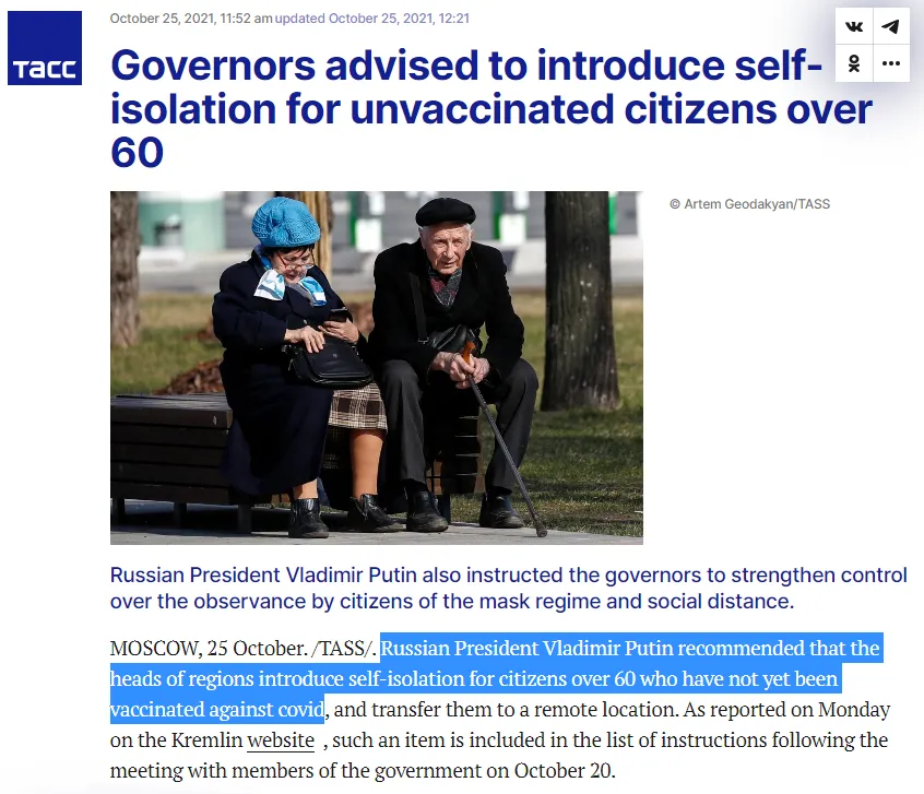 Am 26. Oktober gab Putin eine Liste von Anweisungen an die regionalen Gouverneure heraus, einschließlich einer „Empfehlung“, ungeimpfte Bürger über 60 Jahre zur Selbstisolierung anzuhalten.