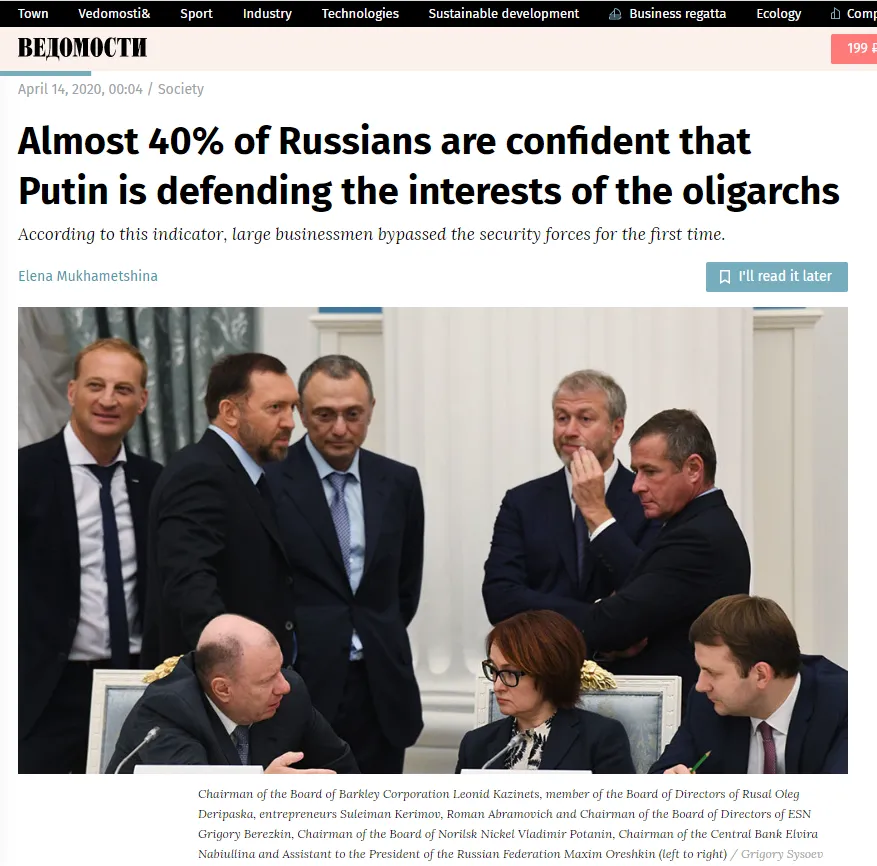 Was Putins Kreuzzug gegen den Neoliberalismus betrifft: Eine vom Levada-Zentrum im April 2020 durchgeführte Umfrage ergab, dass 38% der Russen der Meinung sind, Putin vertrete in erster Linie die Interessen von Oligarchen, Bankern und Großunternehmern.
