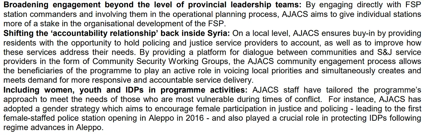 FSP, eine unbewaffnete zivile Schattenpolizei, die in von der Opposition kontrollierten Gebieten operiert, wurde unter der Schirmherrschaft des vom britischen Geheimdienst finanzierten Programms „Access to Justice and Community Security (AJACS)“ gegründet, finanziert und ausgebildet. In einer perversen Ironie deuten durchgesickerte Adam-Smith-International-Akten zu diesem Projekt darauf hin, dass auch hier versucht wurde, Frauen für Propagandazwecke auszubeuten, indem eine Geschlechterpolitik angewandt wurde, „um die Beteiligung von Frauen in der Justiz und Polizeiarbeit zu fördern“. Das Unternehmen prahlte damit, dass von den 1.868 Polizeibeamten, die im Rahmen des Programms ausgebildet wurden, sechs – 0,32 Prozent – weiblich waren.