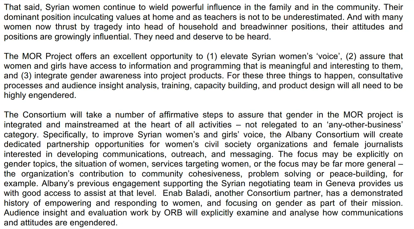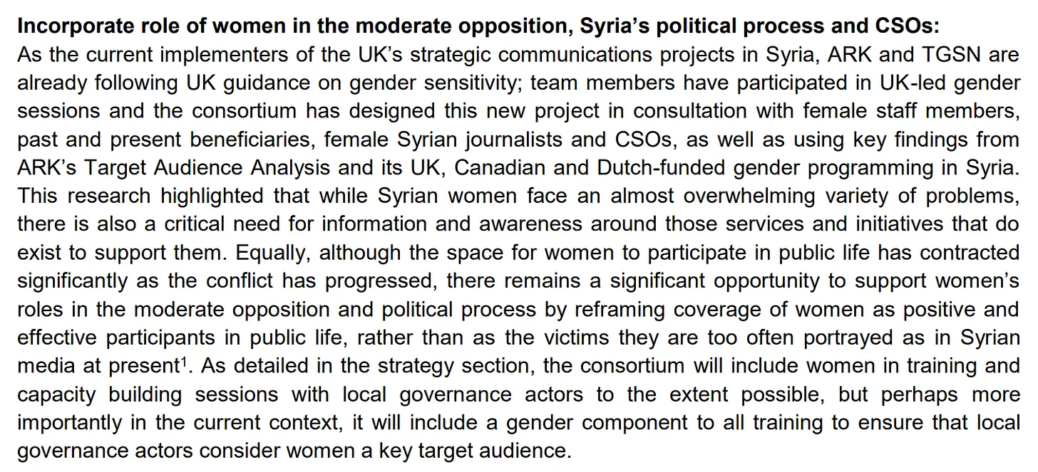 Daher war sich ARK „der Risiken einer Förderung der Beteiligung von Frauen über die derzeit akzeptierten sozialen Normen hinaus … sehr bewusst, da dies die Resonanz der Botschaft behindern oder zu einer Gegenreaktion gegen die Beteiligung von Frauen führen könnte“. Daher schlug ARK vor, „die Darstellung von Frauen subtil umzuformulieren … und die Berichterstattung über ihre Initiativen und Meinungen zu erhöhen, soweit es der Kontext zulässt“.