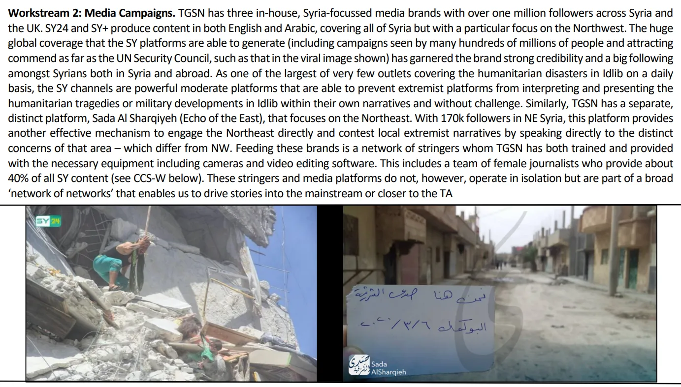 Ein wichtiges Ziel der Kampagne war es, dafür zu sorgen, dass „Lehrerinnen“ in den westlichen Medien ausführlich behandelt werden. Darüber hinaus rühmte sich ARK in vielen durchgesickerten Dateien des riesigen Netzwerks von Journalisten, die sie in Syrien ausgebildet und finanziert hatte und die über solche PR-Stunts berichten würden, die von der Organisation heimlich inszeniert wurden. Ihre Berichte wiederum flossen in die „gut etablierten Kontakte“ der Firma zu großen Nachrichtenagenturen wie Al Jazeera, BBC, CNN, The Guardian, New York Times und Reuters ein, was „ihre Wirkung noch verstärkte“.