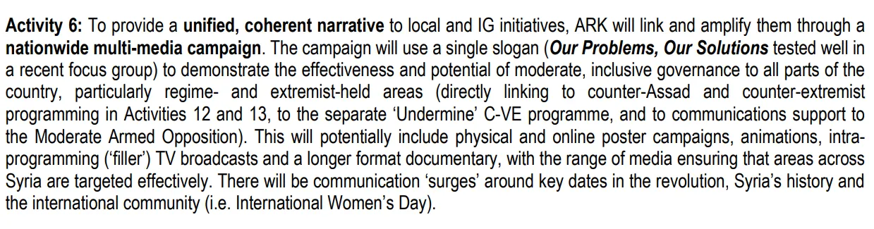 Um die „internationale Gemeinschaft“ für dieses Ziel zu gewinnen, plante Global Strategy in Zusammenarbeit mit ARK – einer zwielichtigen „Beratungsfirma für Konflikttransformation und Stabilisierung“ unter der Leitung des erfahrenen MI6-Offiziers Alistair Harris – „Kommunikationsschübe“ rund um „Schlüsseldaten“ wie den Internationalen Frauentag.