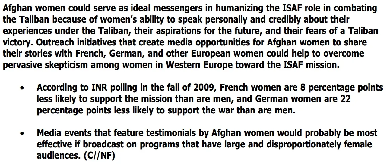 Der propagandistische Wert von Frauen in Konflikten wird seit langem von westlichen Geheimdiensten zynisch ausgenutzt. In einem durchgesickerten CIA-Memorandum vom März 2010 über verdeckte Mittel zur Erhöhung der schwindenden Unterstützung für die Afghanistan-Mission der NATO wurde festgestellt, dass Frauen „als ideale Botschafterinnen“ dienen könnten, um die militärische Besatzung zu „humanisieren“. Dies liege an ihrer „Fähigkeit, persönlich und glaubwürdig über ihre Erfahrungen unter den Taliban, ihre Zukunftserwartungen und ihre Angst vor einem Sieg der Taliban zu sprechen“: