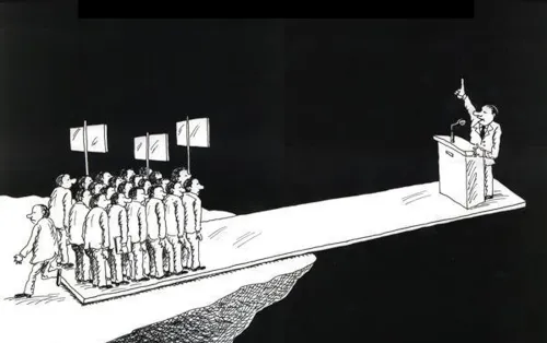 Es gibt ein weiteres Bild, das ich oft zitiere und das meiner Meinung nach dem alten Sprichwort „ein Bild sagt mehr als tausend Worte“ gerecht wird. Es ist das Bild eines Politikers, der am anderen Ende eines über eine Klippe baumelnden Brettes steht. Er wird buchstäblich von den Leuten gestützt, die seiner Rede am anderen Ende des Brettes zuhören. Aber eine Person – vermutlich desillusioniert von dem Politiker – verlässt das Brett.