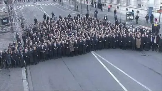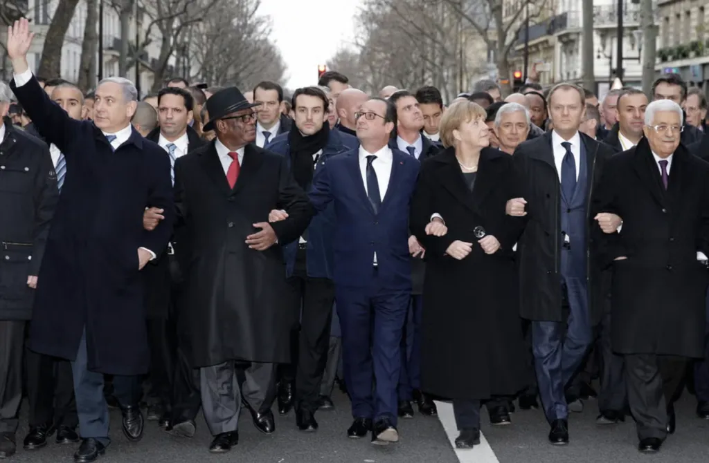 Oder als die Weltpresse versuchte, uns davon zu überzeugen, dass die tapferen Führer der freien Welt mutig die Arme verschränkten, um ihr Engagement für die Meinungsfreiheit zu demonstrieren, indem sie den Pariser Einheitsmarsch nach dem Anschlag auf Charlie Hebdo anführten?