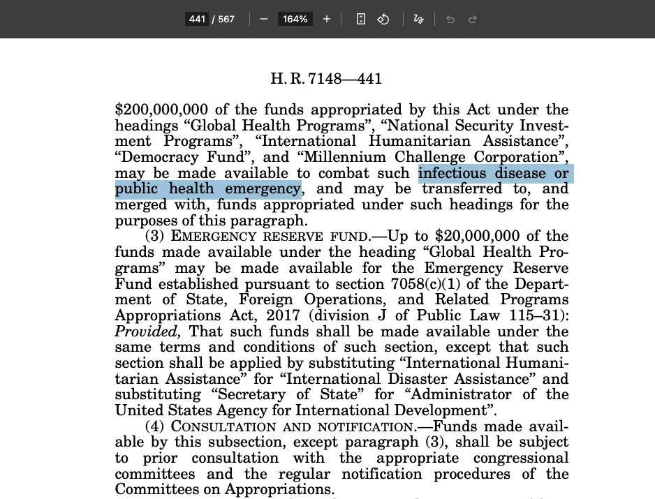 „200.000.000 Dollar der durch dieses Gesetz bewilligten Mittel […] können zur Bekämpfung solcher Infektionskrankheiten oder Notfälle im Bereich der öffentlichen Gesundheit bereitgestellt und zu diesem Zweck auf die unter diesen Überschriften bewilligten Mittel übertragen und mit diesen zusammengelegt werden.“