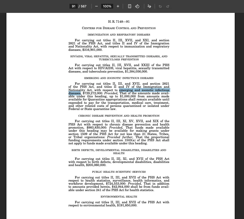 Eine Überprüfung des Gesetzestextes zeigt, dass der Kongress Milliarden von Dollar aus mehreren Bundeskonten für Pandemievorsorge, Ausbruchsbekämpfung, medizinische Gegenmaßnahmen, Überwachung neu auftretender und zoonotischer Krankheiten sowie Notfälle im Bereich der öffentlichen Gesundheit bereitgestellt hat.