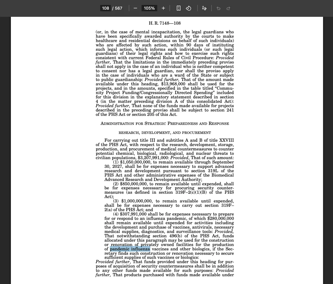 „307.991.000 Dollar sind für Ausgaben vorgesehen, die zur Vorbereitung auf eine Influenza-Pandemie oder zur Reaktion darauf erforderlich sind, wovon 280.000.000 Dollar bis zur Verwendung für Aktivitäten wie die Entwicklung und den Kauf von Impfstoffen, antiviralen Medikamenten, notwendigen medizinischen Hilfsgütern, Diagnostika und Überwachungsinstrumenten verfügbar bleiben.“