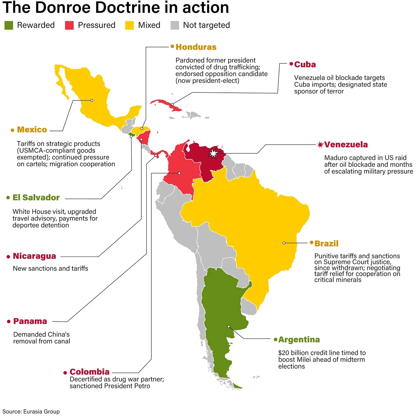 Stunden nach Maduros Festnahme und Auslieferung an die Vereinigten Staaten veröffentlichte ein offizieller X-Account der Trump-Regierung ein Bild von Trump, der über Nord- und Südamerika steht und einen Schläger mit der Aufschrift „Donroe-Doktrin” in der Hand hält. Dieses Bild wurde dann von Kriegsminister Pete Hegseth retweetet.
