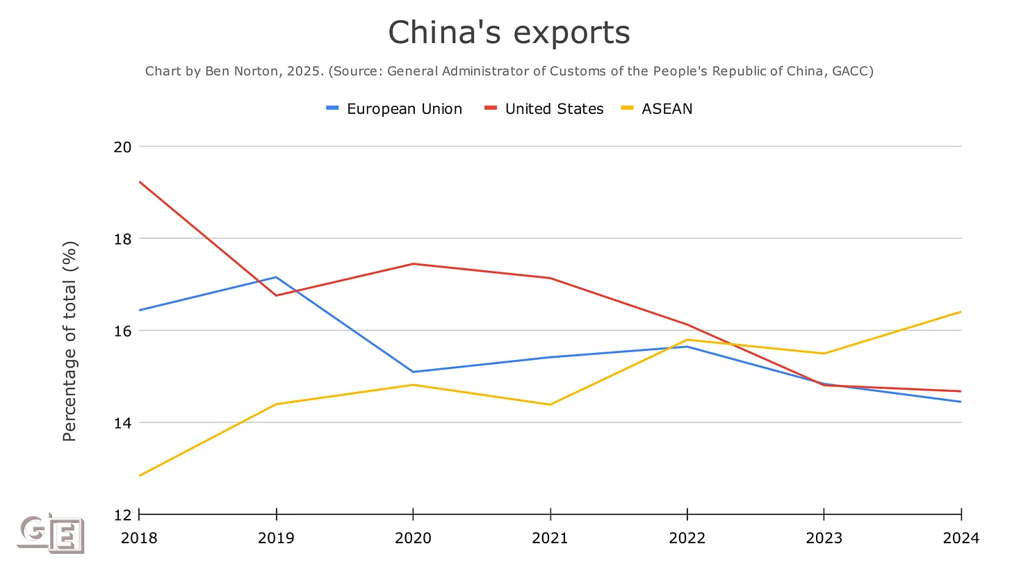 China hingegen hat seinen Handel in den letzten Jahren diversifiziert und ist daher nicht mehr so stark vom Verkauf auf dem US-Markt abhängig. Während Trumps erster Amtszeit, als er 2018 den Handelskrieg mit den USA begann, gingen 19,23 % der chinesischen Exporte in die USA; bis 2024 sank dieser Anteil auf 14,67 % und geht seitdem jedes Jahr weiter zurück.