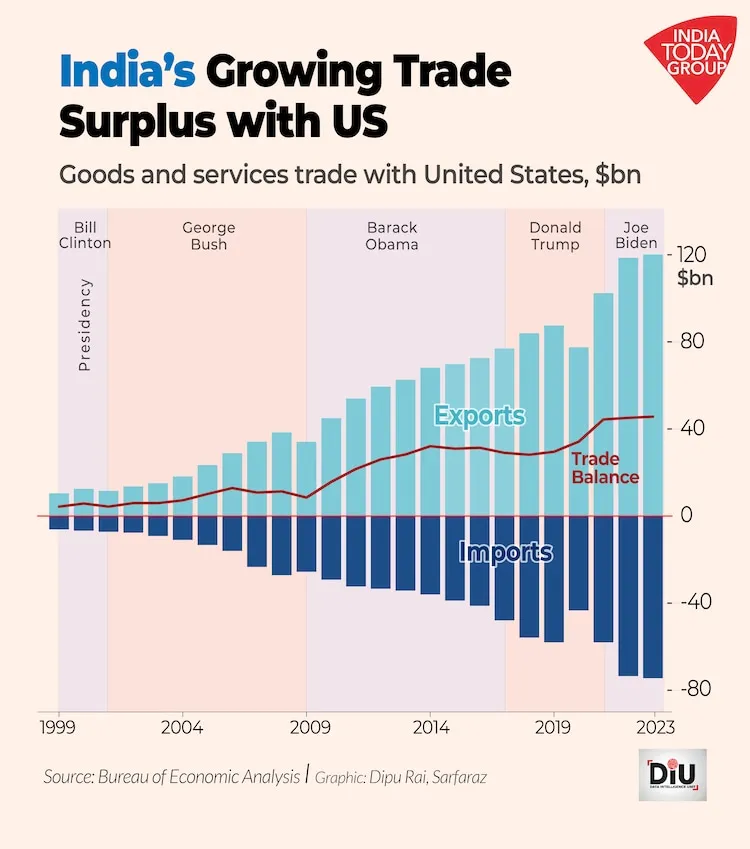 Was Trump wirklich beschäftigt, ist der große Handelsüberschuss Indiens gegenüber den Vereinigten Staaten, der in den letzten Jahren gewachsen ist.