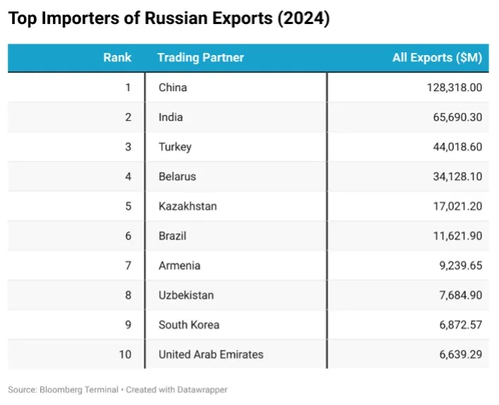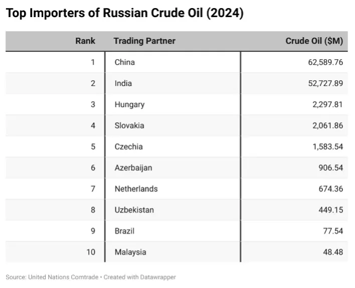 Im Jahr 2024 überholte China Indien als wichtigster Importeur von russischem Öl. Zusammen sind China und Indien jedoch mit Abstand die beiden größten Abnehmer und nehmen den größten Teil der Gesamtimporte ab.