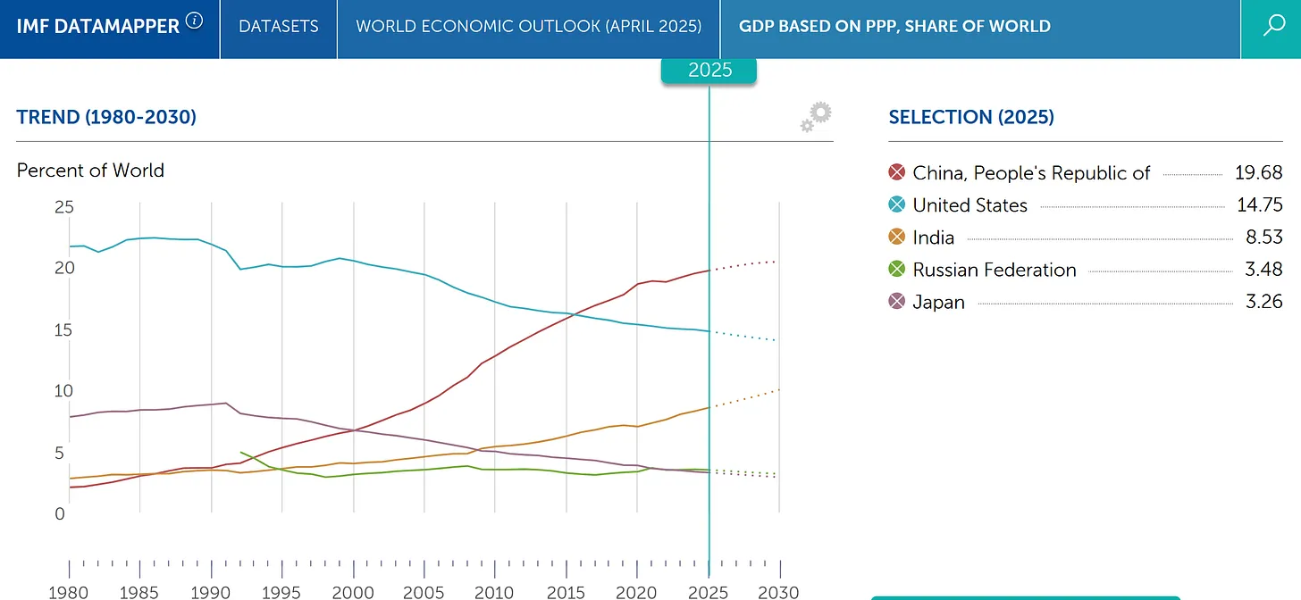 China ist die größte Volkswirtschaft und macht 19,68 % des weltweiten BIP (KKP) aus. Die USA sind mit 14,75 % die zweitgrößte Volkswirtschaft. Indien liegt mit 8,53 % an dritter Stelle. Russland ist mit 3,48 % Vierter.