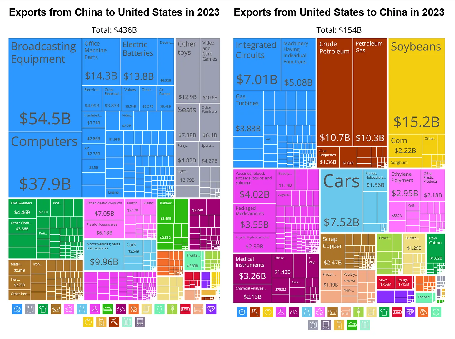 Zu den wichtigsten chinesischen Exportgütern in die USA zählen Mobiltelefone, Computer, Batterien, Halbleiter, andere Technologien, Maschinen und Maschinenteile.