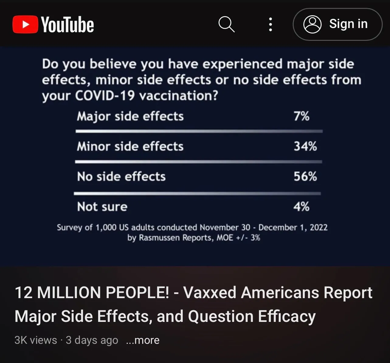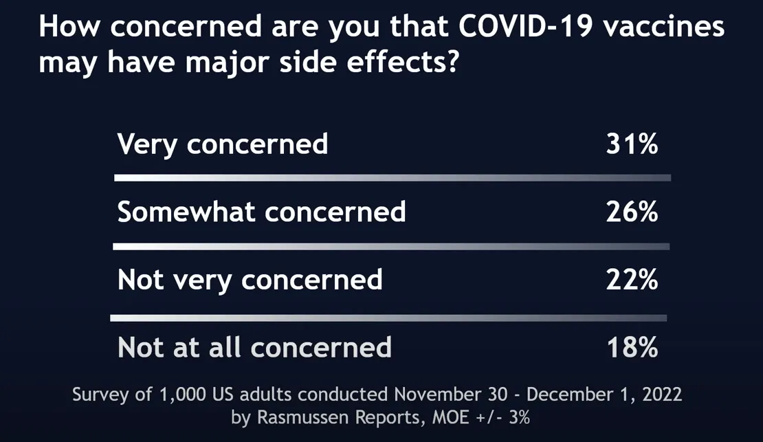 57 % der Amerikaner sind besorgt über schwerwiegende Nebenwirkungen. Hätten sie nur Beamte des öffentlichen Gesundheitswesens oder Leute, die bei der CDC arbeiten, befragt, würde ich wetten, dass die Zahl bei 0 % liegen würde, weil diese Leute alle das Kool-Aid trinken.