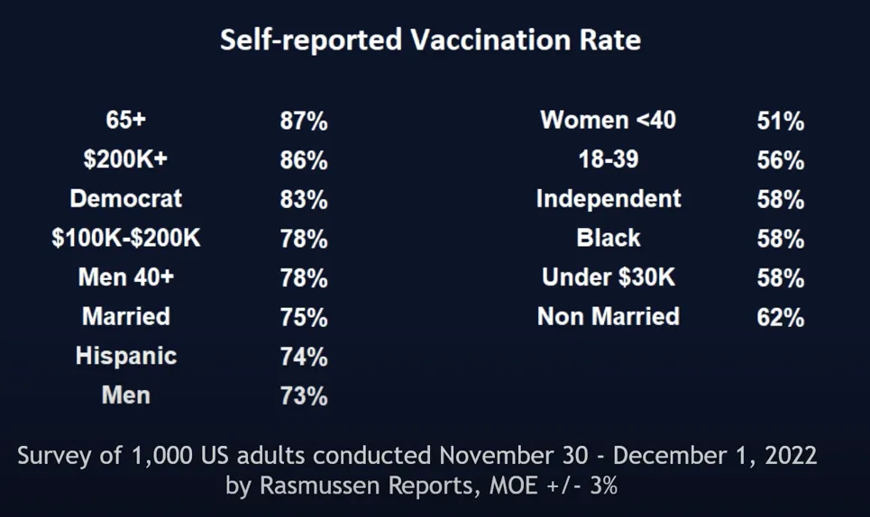 Rasmussen befragte die amerikanische Bevölkerung in einer einfachen Umfrage mit vier Fragen und stellte fest, dass meine Umfragen korrekt waren, ebenso wie die Daten von V-safe und der Sicherheitsbericht des israelischen Gesundheitsministeriums, den niemand sehen will.